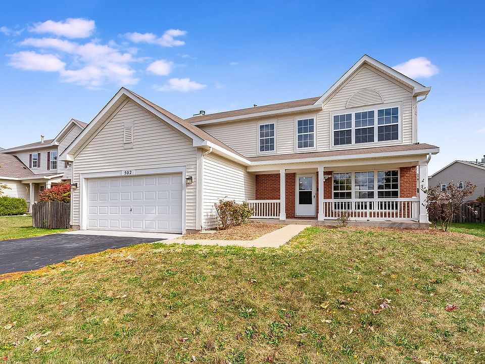 Classic 2 Story home located in desirable Lakewood Springs just a short walk to the pool, clubhouse, and nearby pond! 502 Kristen Street won't disappoint and is truly MOVE-IN READY! The front porch welcomes you as you arrive through the front door into the foyer, living room, and dining room all showcasing brand new LVT flooring throughout. Step into the eat in kitchen which is very pleasing to the eye with newly painted white cabinets, and stunning new light stone quartz countertops! Plenty of room for a breakfast table, and is a great connection point to the backyard! Enjoy a fully fenced yard, and NEW concrete patio that's sure to be your hangout this Fall around a cozy fire! Let's head back in and check out the spacious family room w/ brick fireplace, nearby half bath, 1st floor laundry, plus garage and basement access. The basement is wide open and awaiting your finishing touches! New Sump Pump 12/24. Attached 2 car garage makes winter a little more tolerable here in IL! Next, head upstairs to find all 4 bedrooms, including a primary suite w/ a generous en suite bath and walk-in closet! The other 3 bedrooms have great natural light and are nearby to the 2nd full bathroom. Brand new carpeting AND fresh paint throughout makes it easy to imagine your 1st night sleeping in your NEW HOME! Enjoy all the amenities Lakewood Springs has to offer as well including the clubhouse, pool, sports courts, many ponds, and nearby conveniences of local shopping, etc. Come explore your new home and neighborhood today!