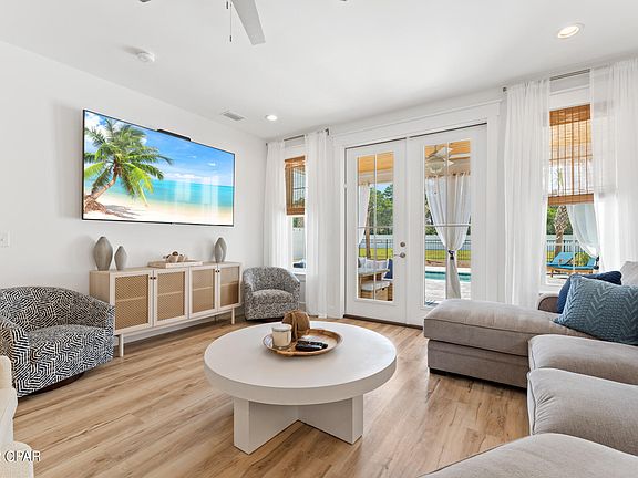 This new construction vacation rental is projected to produce over $150K-$200K in base rental income. Enviably located next to Pier Park shops, restaurants and outdoor activities, this surprisingly spacious beach house has porches on both levels. Constructed less than a year ago, the appliances, furniture and fixtures are like new. It has a large private outdoor living area with a pool and six bedrooms to accommodate up to 20 guests. It's ideal for vacation rentals when not in use by the owner. What's more, this beautiful beach home is just three minutes from the beautiful white sands of Panama City Beach. The interior decor is to the highest standard with handpicked designer wallpaper, tastefully curated furniture and artworks delivering sensory pleasure and harmony throughout the home. The bright open family room is a communal gathering place for meals and social chatter. Throw open the French doors and enjoy pool views from the deep, cushioned sofa and chaise. The private backyard has a heated pool for hours of pleasure and the covered deck with its tie-back curtains creates a comfy gazebo-style living area for sharing drinks, chatter and laughter. There's a well-laid-out kitchen for large-scale cooking with a lengthy island breakfast bar that doubles as prep and serving space. Six generously sized bedrooms, each with its own character and smart TV, allow everyone to enjoy their own private space. Make use of the garage for storing beach chairs and bicycles. There's ample parking for vehicles on the paved driveway. All this, just a short walk from the stunning white sandy beach.