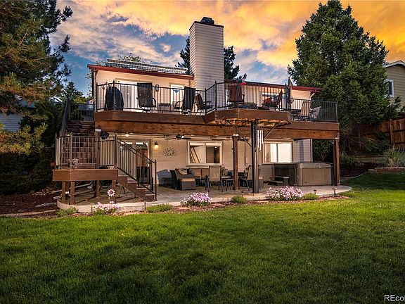 Welcome home to this beautiful ranch in the sought-after subdivision of Highlands Ranch that sits on almost a quarter acre! When entering the home, you're greeted by vaulted ceilings in the open formal living and dining area. Next, you'll find a gourmet kitchen with included stainless-steel appliances, a 5-burner gas cook top, granite counter tops, beautiful white cabinets, stone back splash and a dining nook. Continue out of the kitchen onto the brand new huge deck, complete with a gas fire pit, included patio furniture, a retractable awning and views of Pikes Peak! The main floor of this ranch home includes updated carpet and light fixtures, upgraded 6 panel solid core fir doors, 2 bedrooms and a full bathroom with granite counter tops. This spacious master bedroom has hardwood floors throughout, a beautifully updated shower and his-and-her closets. In the finished basement you'll find a large family room complete with a full wet bar; great for entertaining! With 2 additional bedrooms and a workout room you will have all the space you need. You can also find the laundry room in the basement complete with a utility sink and an included washer and dryer. Speaking of entertaining, continue through the basement onto the brand new stamped concrete patio with an included hot tub! Sitting below the new deck with an included rain escape system, fans and speakers, you will be sure to enjoy the gorgeous yard, rain or shine, with all the privacy in the world. With 4 included recreation centers, trails, parks and plenty of nearby restaurants there are activities for everyone!