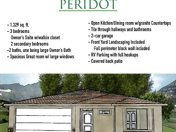 Under Construction! Estimated finish date - June 20th, 2025. This home features drought-tolerant professionally landscaped front and backyard with a covered patio. Master suite includes spacious walk-in closet and fully tiled walk-in shower. Two car garage is fully drywalled and painted! Quality GE appliances, stainless sink in the kitchen island, Moen Plumbing fixtures, quartz countertops, spacious pantry, and natural Alder cabinetry with soft-close hinges and under-cabinet lights. Loads of cabinet space! Woodgrain tile floors and gas fireplace in living room. Thirty-foot paved RV pad with water, 30-amp + sewer dump! Come in and see us soon to customize the home to your liking. See you soon!