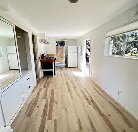 This is a cozy, private and peaceful studio in the highly desirable area of San Roque. . This studio has brand new wood like flooring throughout, many windows providing generous natural light, Brand New deck of living space with beautiful nature views and stunning oak trees. The living/sleeping area has built-ins in the closet space. There is a kitchen with small sink, new stove, a refrigerator and microwave oven. The bathroom has a shower. This studio apartment is small so is perfect for an office space or someone who may travel often. All utilities are included. Non smokers and no pets. One off street parking, shared washer and dryer, Available now with month-to-month lease but prefer long term. Shared Washer & Dryer