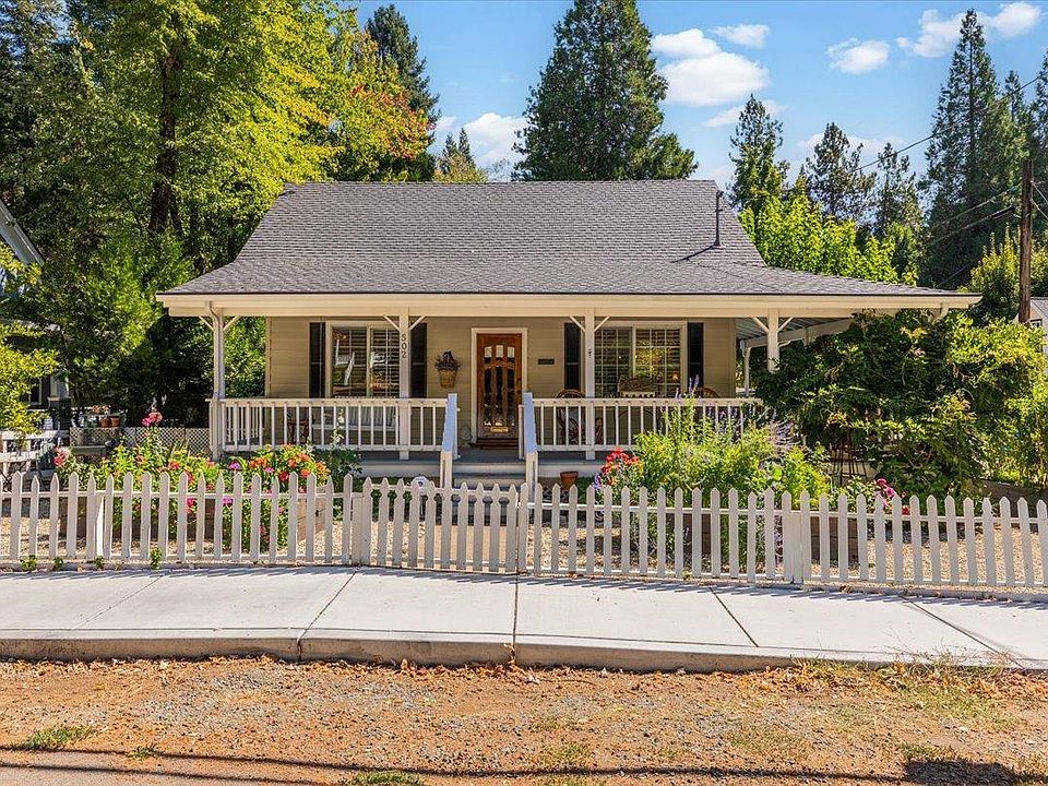 The Quintessential Downtown Nevada City Home: This Turn-of-the-Century Craftsman beauty has been updated throughout and is located on a corner lot in one of the friendliest and most desirable neighborhoods in Nevada City, a few minutes walk from all of town's charm: restaurants, night-life, shopping. Abundant garden beds and covered wrap-around porch lead you into this bright and cheery home with floors of hardwood and Soho Brick-look Porcelain, plantation shutters, and skylights. Formal living room has picturesque windows. Kitchen is inviting with quartz countertops and views of covered back porch. Two ensuite bedrooms, 1 guest bedroom, plus an office! Primary suite is full of natural light and can access the backyard. Kitchen and bathrooms have been recently updated with Rohl fixtures; 1 has deep clawfoot tub, two have custom tile walk-in showers. Sweet dining area can access the covered side porch. Spacious and very private covered back porch plus roomy backyard is perfect as an outdoor entertaining space! Extra-deep garage with side entrance. Auto Generac. This property is absolutely stunning, and turn-key. The home you have been waiting for.