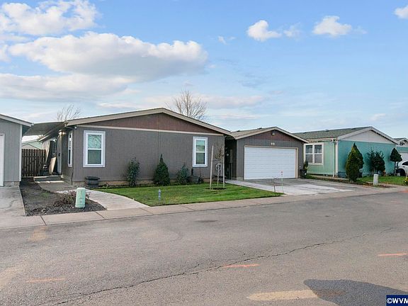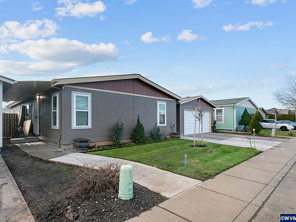 Updated 1997 manufactured home in well kept, all age park in Woodburn. Features include beautiful stonework arch and electric fireplace, new windows, natural stone kitchen countertops, tiled bathrooms, flooring insulation, 2 car garage with office space, fenced yard with new gate, covered patio, outdoor kitchen. Master bedroom is separate from other 2 bedrooms. Close to schools!
