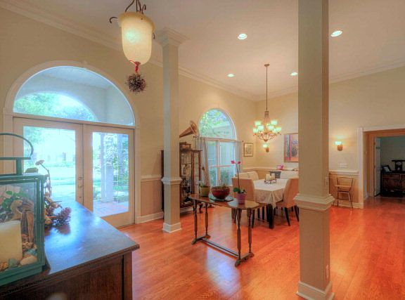 One Level Home with Hardwood Floors through out (tile in bathrooms), 13 ft ceilings in Family Room and Dining Room. Living room enjoys a shared, see-through fireplace with the sunroom. Bring the outside in with a wonderful Sunroom which opens onto a large entertainment sized patio, a 16'X32' kidney shaped pool & fenced backyard -- great set up for parties! All bedrooms enjoy a private bath and one has a Handicap accessible vanity & shower. Master has two closets - one is walk in - separate shower & whirlpool bath. Upstairs over the 3 car garage, is huge 4th bedroom with a full bath. Plus there is lots of finished heated and cooled storage space upstairs AND there is a gigantic attic for floored storage.