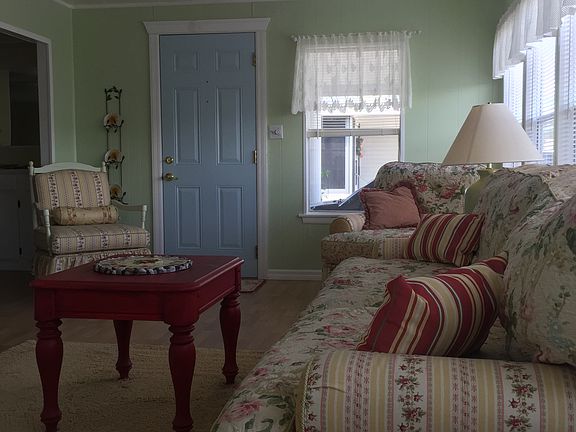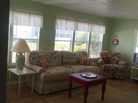 This pretty yellow "Florida cottage" home has shiny white tile, wood laminate, new carpeting throughout. Setting this home apart is the beautiful white molding that enhances the main rooms which are painted in pretty yellows, greens, and blues Master and main bathroom have the higher custom-made vanities. Beautiful, new lighting, huge walk- in closet in master bedroom. New standard front door replaces mobile home looking door. Lots of windows give the home a bright, cheerful feeling. Frontyard professionally landscaped with lots of Florida plants and flowers. This home is truly unique with the cuteness factor in every room. The furniture perfectly fits the cottage home feeling. New central air, garbage disposal, pipes under home. Home has a spa room with hot tub.