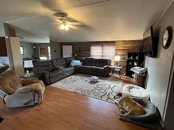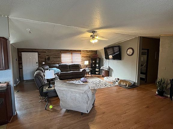 Ready to move in 4 Bedroom and 2 Bath home on a large fenced in corner lot! This manufactured home has an OPEN FLOOR PLAN with plenty storage and counter space. The home has been updated with shiplap accent wall simple textured walls and guest bathroom completely redone. You’ll love the huge master bedroom with large closet and full bathroom with corner tub, separate shower, and a double sink. This property has a spacious insulated shop and two out buildings. Only a block away from the local school.
