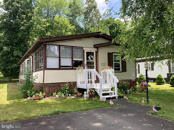Come see this spacious Wayne model Neshaminy Falls 55+ home that backs up to a wooded area and comes with a grand room and high vaulted ceilings! Park right in front of your beautifully landscaped home and walk a few steps into a roomy enclosed porch. Marvel at the open-concept grand room with a conversation sitting area on one side and the other for TV watching and cozying up to a warm fireplace in the wintertime. This huge space is also open to a newly renovated kitchen with newer cabinets and flooring and dining space that comes with the china cabinet. Bedrooms are conveniently placed on opposite sides of the home for privacy when entertaining overnight guests. The huge primary bedroom with new carpeting has an overhead fan, ensuite bathroom, vanity, walk-in closet, commode, and newer walk-in shower stall. The guest bedroom is towards the front of the home with an overhead fan and closets. The powder room is just off the living room and includes closets for even more storage. This home comes with all-new windows, refrigerator, w/d, dishwasher, kitchen table and 2nd bedroom furniture. Make your appointment soon!
