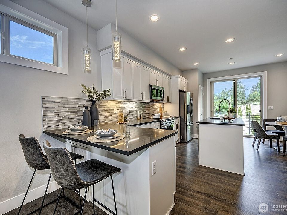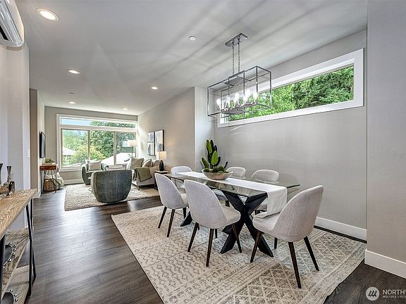 Welcome to this stunning END UNIT townhome, just minutes from downtown Edmonds! Blending modern design with a prime location, this newer home showcases 10’ ceilings, quartz counters, stainless appls.,luxury hrdwd laminate, and designer finishes throughout. The open-concept layout is flooded with natural light, while added comforts include A/C, EV charger, oversized tandem garage w/extra storage, deck off kitchen, and patio off garage. Upstairs, enjoy Primary ensuite w/walk-in closet, guest bedrm and convenient upstairs laundry. LOW DUES OF $60 MONTHLY-Community green space, trails, and dog run add to the appeal. Enjoy Edmonds waterfront, shops, dining, and parks. This turnkey home is the perfect combination of style, comfort, and location.
