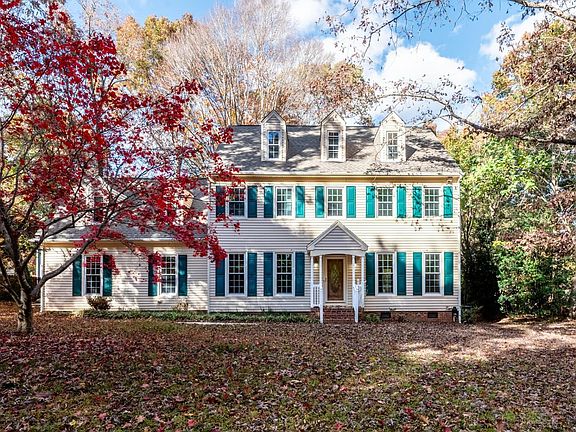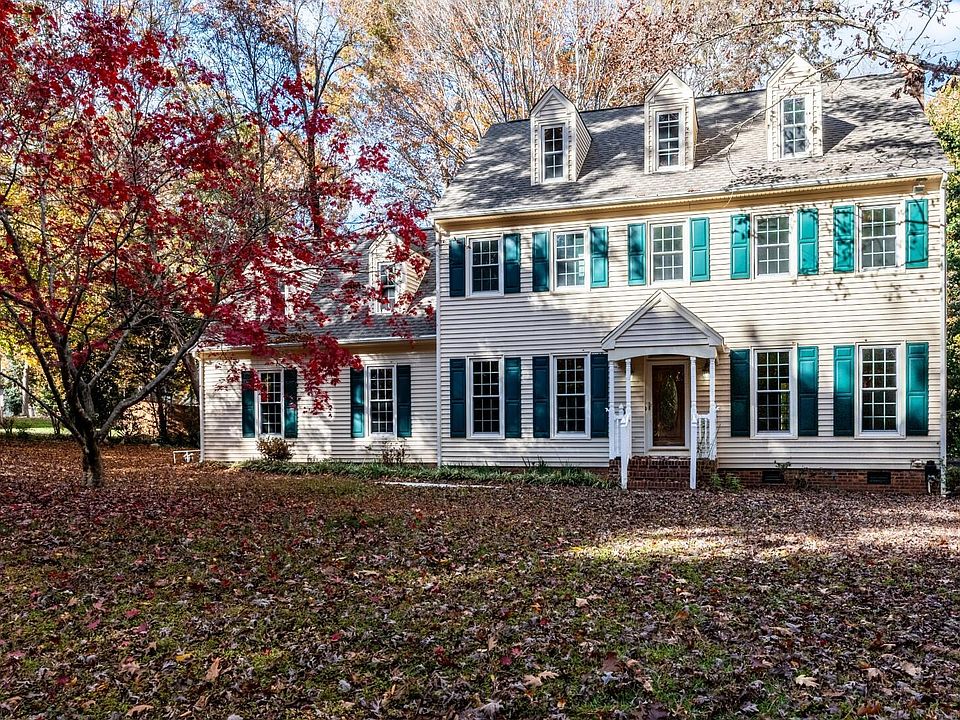This 2-story colonial offers a blend of classic charm with some modern updates. Located in Raleigh, enjoy easy access to Creedmoor Road, I-540, Wildwood Green Golf Course, RTP, and RDU Airport. The main floor features hardwood flooring throughout living areas and hardwood stairs leading to the second floor. The living room flows through divided glass French doors to the family room, which features a brick wood-burning fireplace. Step out to a large wood deck and paver patio for outdoor living. The functional kitchen has oak cabinets, a walk-in pantry, and is prime to update like you want when you want. A breakfast nook and formal dining room complete the common areas. A half bath in the foyer hall offers convenience on the main floor. Upstairs, the primary bedroom offers a remodeled en-suite bathroom with dual vanities, granite tops, a soaker tub, and a glass-enclosed walk-in shower. Three additional bedrooms feature new carpeting and ample closet space. A full bath with updated tile bathtub surround serves these rooms. The laundry closet includes a washer and dryer. A highlight is the permitted theater room with a screen and blackout curtains, providing direct access to the secondary staircase and attic. The attic offers approximately 300 sq ft of floored storage. Key features include architectural shingles, vinyl replacement windows, natural gas heat on both floors, and a recently replaced second-floor HVAC unit with new ductwork. An encapsulated crawl space with dehumidifier and Radon mitigation, a gas tankless hot water heater, a 2-car garage with openers, two staircases (front and secondary), and a gas fireplace stub for easy conversion to gas logs.