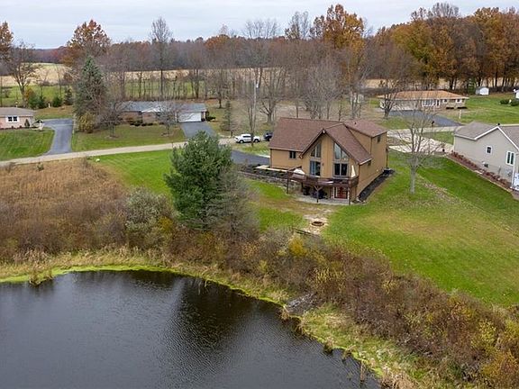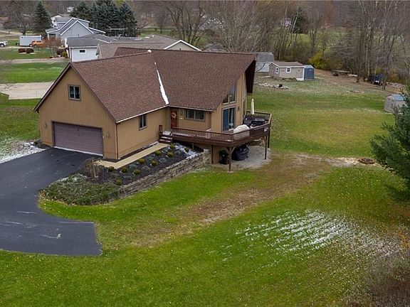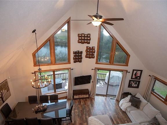 You will be captivated by the breathtaking views from this stunning A frame. A wrap around deck envelopes the front of the home overlooking the beautiful signs of country living. This home is stunning from the moment you walk in the door. An open concept welcomes you with a brand new kitchen donning granite countertops. New pergo flooring throughout the living room, dining room, and kitchen. A master suite upstairs offers a full bathroom, 2 closets, a cozy nook overlooking the living room offers the perfect space for a home office or a reading nook. The finished walk out basement offers an additional living space with recessed lighting. French doors lead to the yard overlooking a pond. The garage offers plenty of space and additional attic storage. The home offers newer electric heat pump and AC and a new roof! A whole house humidifier and 200 amp electrical service.