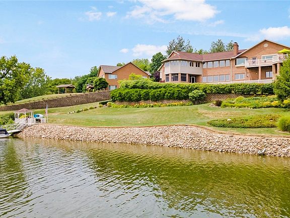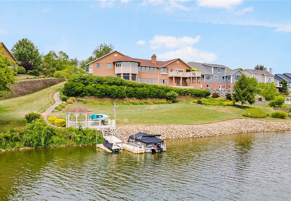 If your dream is to own lakefront property you just found it! This fabulous, all brick home offers 3,228 sq.ft. on the first level, an additional 2,955 sq.ft. in the walk-out lower level, 202 feet of lake frontage & your own dock. When you're not on the water, you can enjoy the beautiful view from nearly every room inside the home including the sunroom & screened porch, or outside on the the maintenance free deck or expansive patio. Entertaining is easy in the spacious great room, family room or remodeled kitchen (Bolon's Custom Kitchens in 2014) with granite counters, stainless steel appliances, hardwood flooring & 2-sided fireplace & adjoining 11' x 8' pantry with two walls of cabinets & a second wall oven. The sellers have loved & meticulously cared for this home, & since owning it they have made many improvements: remodeled master bath, replaced concrete on patios & front porch, installed maintenance free decking on house & dock, replaced dock, ramp, steps, & jet ski port, installe