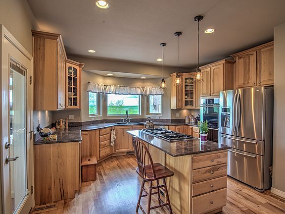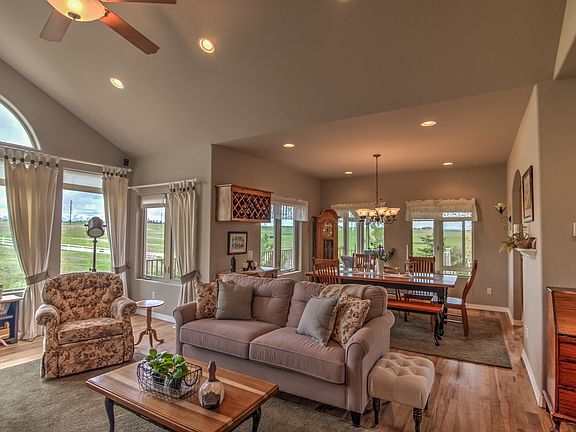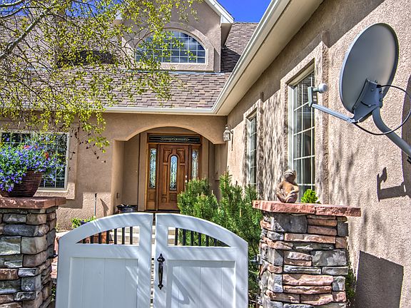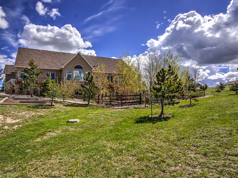 Fantastic, 4 bedroom stucco, ranch style home on 5 acres with a wonderful Pikes Peak view. One owner home that is in move in condition. Extensive landscaping has been completed with irrigation system. Front entry is stunning with lots of decorating opportunity on the ledges. Hickory hardwood flooring throughout most of the main level living areas. Expansive gourmet kitchen with Edison style pendant lighting, gas range with downdraft, six burner stove, double oven, hickory cabinets, under cabinet lighting, and granite countertops. Two dining areas, a breakfast nook in the kitchen and a larger separate dining area as well. Vaulted ceilings in the living room w/ large picture windows facing Pikes Peak and floor to ceiling rock surround gas fireplace. Office/study conveniently located next to the entry with an additional gas fireplace. Master suite is very impressive w/ lots of windows and very spacious, a private deck, gas fireplace, two separate walk-in closets, and a 5 piece bath with a jetted tub. Main level also includes laundry w/ sink, ? bath that?s very convenient to the kitchen, a 2nd bedroom and an incredible sunroom that is not included in the square footage of the home. Walk-out lower level to include a large family room including a wet bar with mini kitchenette. Additionally, the 3rd and 4th bedrooms on the lower level and are very spacious with a full Jack and Jill bathroom separating the two. The outdoor living space surrounding this home are second to none with two decks and two patios. High efficiency furnaces, one for each level and central A/C. Subarea allows for horses and there is a nice equestrian/walking trail around the perimeter of community. All paved roads and easy access. Come take a look, you will not be disappointed!!
