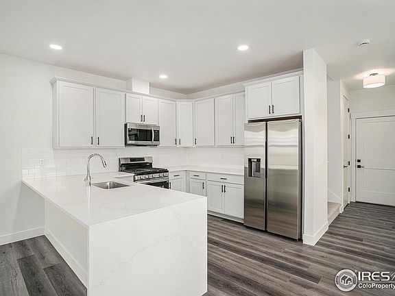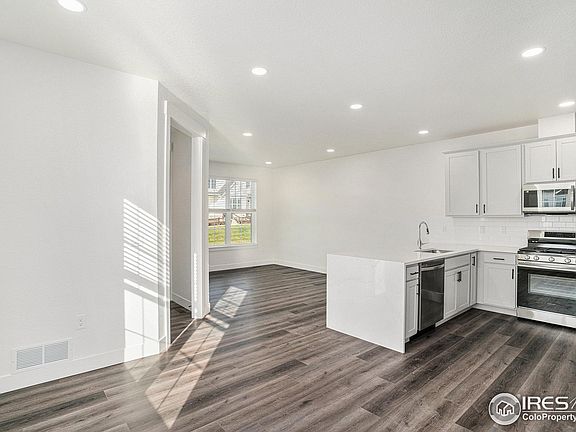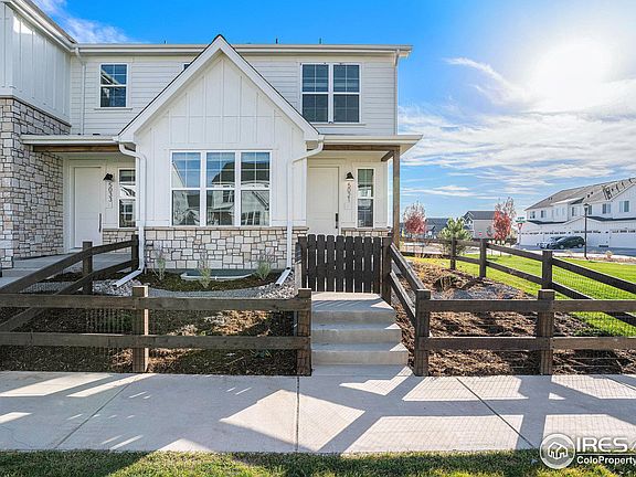 Spring Sales Event, Reduced Pricing for a Limited Time! Move-In Ready! Incredible Mountain views, premium location next to park like greenbelt. The Zion plan features 3 bedrooms and 3 baths with tons of natural light as an end unit! This home includes the Essential Upgrade Package featuring, upgraded quartz countertops, full tile backsplash, tile floors in baths, built in entry bench, SS Refrigerator and washer/dryer. Standard inclusions such as painted cabinets, LVP floors, A/C, tankless water heater, window blinds and designer finish packages will wow you! Each home has a fenced front yard and there is a community dog park, play structure, and greenbelts throughout the development. The oversized 2 car garage provides ample parking and there is room to grow in the unfinished basement with 9'ft foundation walls (option to finish). This incredible community is conveniently located in Northwest Loveland, close to regional trails, open space, shopping, easy access to Fort Collins, Loveland and breathtaking mountain views.