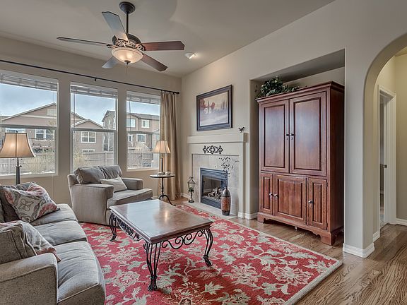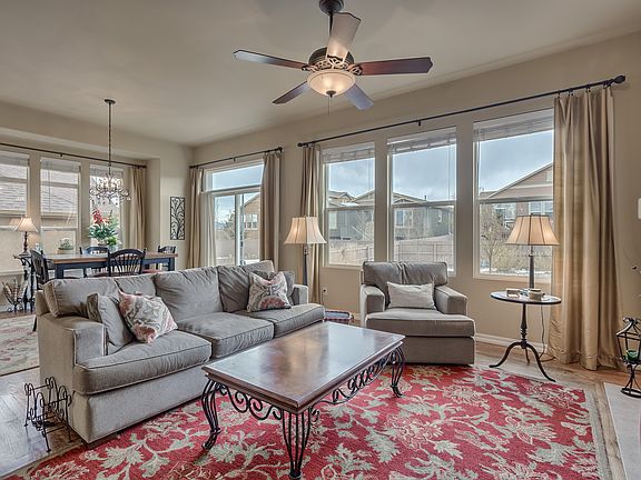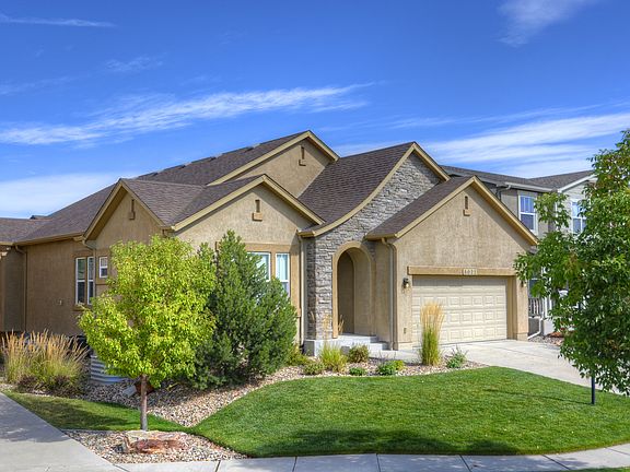 Stunning ranch style home in Cordera featuring 4 bedrooms, 3 bathrooms, oversized 2 car garage and 3,338 square feet offers true main level living. This home is the perfect blend of elegance and livability. You are greeted by expansive hardwood flooring that lead through the open floorplan to the spacious great room with gas fireplace. The perfectly appointed kitchen offers abundant counter and cabinet space, granite counters, upgraded stainless appliances, dual fuel range oven, and adjoining nook. The formal dining room is adjacent to the great room and kitchen. Unwind in the main level master suite providing adjoining 5-pc bathroom and walk-in closet. There is a spacious secondary bedroom on the main floor that is just steps away from a full bath. Enjoy entertaining in the sprawling finished basement with large family room, gaming and billiards area. There are two additional secondary bedrooms, full bath and ample storage in basement. Step out to the oversized patio overlooking the manicured yard. Enjoy Front Range views from the back yard. Walk to award winning District 20 schools. Located just blocks from the Cordera Community Center, Pool and Grand Lawn. Conveniently located to shopping, dining, I-25, Powers Blvd. and military bases.