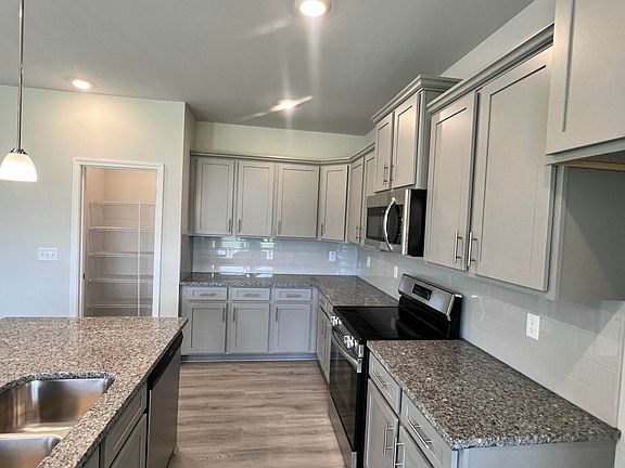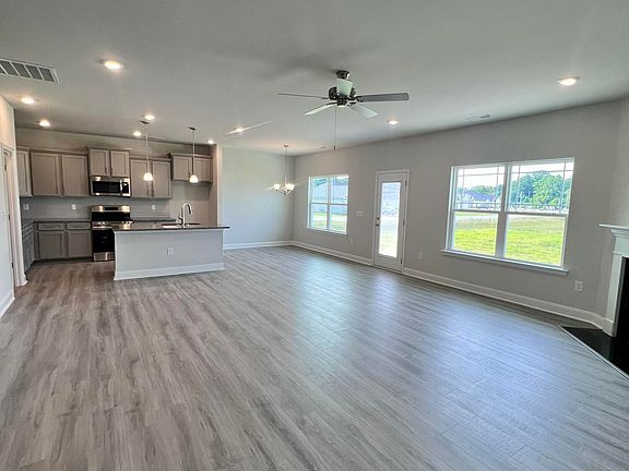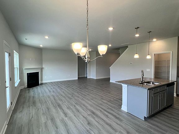 Continue down the foyer to the heart of the home: a stunning kitchen complete with granite countertops, a massive island, and a stainless steel appliance package. The kitchen opens to a large living area with a cozy gas-log fireplace, creating the perfect space for relaxing and entertaining.