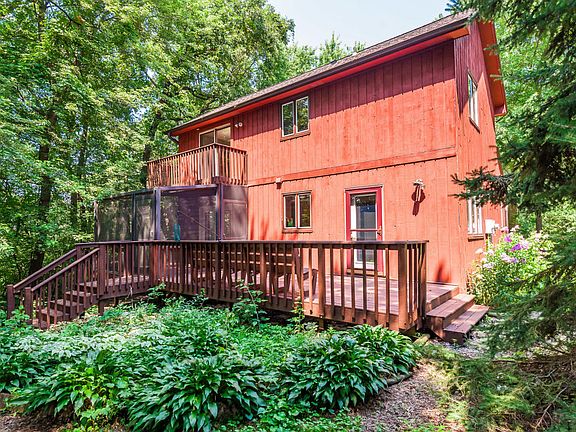 Woodland Estates cottage in the woods on a private .6 acre lot w/ cul-de-sac location! Updated w/ new roof, new AC, fresh paint inside & out, updated baths, & all new windows on order. Plenty of storage w/ 912 sq ft garage w/ steel roof. Other great features include cozy pellet stove, balcony off master bedroom, great deck & screened in porch, main floor laundry, dog run, & lots of privacy!