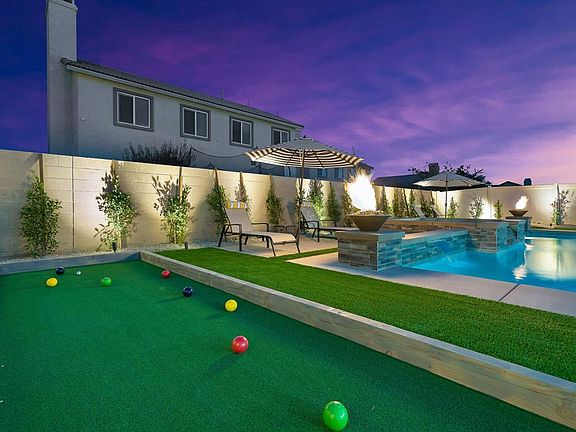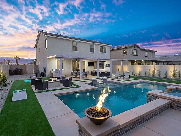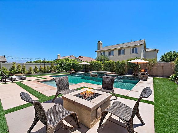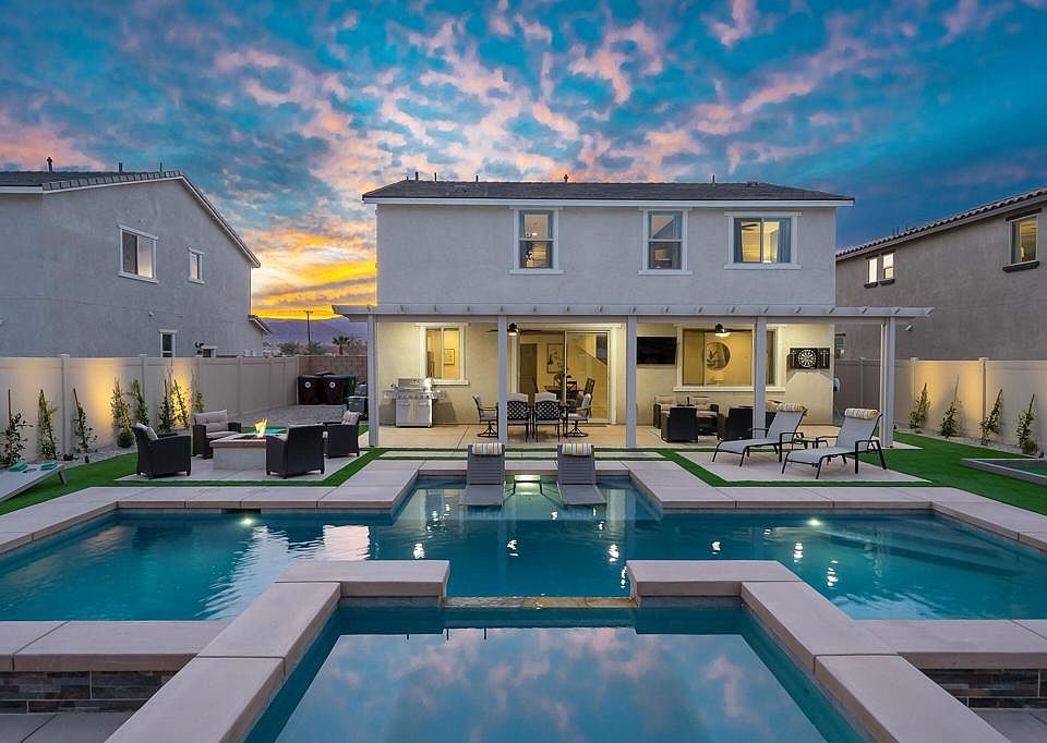 Debuting to the market is this stunning resort-style home was meticulously crafted by Pulte Homes in 2020. Nestled in the heart of Coachella. Offering six spacious bedrooms, the three full bathrooms and with 2,376 square feet of living space. The versatile game room-office flex space is ready to adapt to your needs as a media room or a peaceful home office. Whether you're preparing a feast for family and friends, the ambiance is always just right. Venture outside to your personal paradise, where the custom oversized pool and spa beckon you to unwind and relax. The expansive custom patio cover, complete with embedded lights and ceiling fans, sets the stage for unforgettable outdoor gatherings. Picture yourself cozying up around the natural gas fire pit on cool desert evenings or challenging friends to a game of bocce ball or a putting green showdown. You will appreciate the upgraded wood laminate flooring that flows seamlessly through the open-concept living space. The heart of this residence is the chef's kitchen, a culinary dream come true. Outfitted with state-of-the-art stainless-steel appliances and a sophisticated lighting package, this space is designed for both gourmet cooking and casual dining. Every detail has been thoughtfully curated to create a perfect blend of elegance, comfort, and fun. No HOA here. Proximity to music festival grounds and Thermal Airport, just 10 minutes away, ensures you're always close to the action and our desert paradise has to offer.