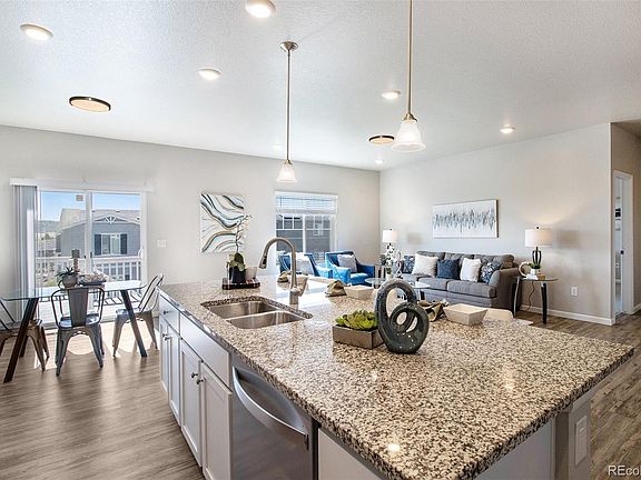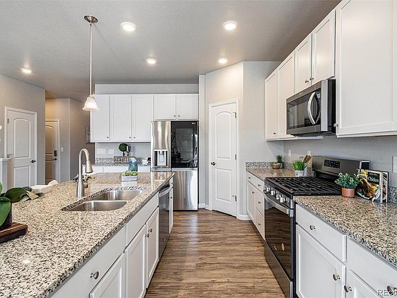 This pristine ranch-style home featuring a walkout basement seamlessly combines style and comfort in an open-concept space. Inside, you'll find luxury finishes like granite countertops and vinyl plank floors. The kitchen boasts a spacious layout with a large island, gas stove, white shaker cabinets, and a walk-in pantry. The primary suite is generously sized with a bath and walk-in closet, while two bedrooms offer privacy at the opposite end. This home surpasses new construction with a beautifully landscaped yard, an active radon mitigation system, and sump pump. The walkout basement, with 9-foot ceilings, offers customization for a personal retreat or entertainment space. The home is equipped with smart technology, and the 2-car garage with elevated ceilings provides ample storage. Enjoy a vibrant neighborhood with events like book clubs and family-friendly gatherings. Parks, scenic trails, and the Pinnacle Clubhouse with an outdoor pool and fitness center offer endless recreation. Colorado's natural beauty surrounds you, with Pikes Peak just minutes away. Easy access to I-25, local dining, and shopping ensures convenience. Join the Crystal Valley Ranch community for comfort, convenience, and scenic delights!