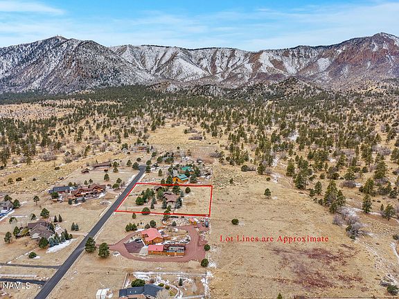 This exquisite mountain home is just in time for the New Year! 2.3 acres in North Peak bordering 1.56 million acres of national forest with amazing views of Mt. Elden. Can be enjoyed by those who need a single level. A/C, 5 bedrooms, 3 full baths and 1/2 bath, 2 living rooms, recreation and storage room w/3 car garage attached. Newly remodeled kitchen has gorgeous granite countertops, breakfast bar, stainless appliances and undermounted sink with vaulted ceiling. The primary bedroom has great views. The hammered copper tub is newly installed and the star! Oversized closet and separate shower. Two bedrooms have Jack and Jill bath. The mother-in-law suite is amazing w/fireplace, vaulted ceilings, wet bar and deck. Detached heated 3 car garage w/studio and half bath. Call today for more info!