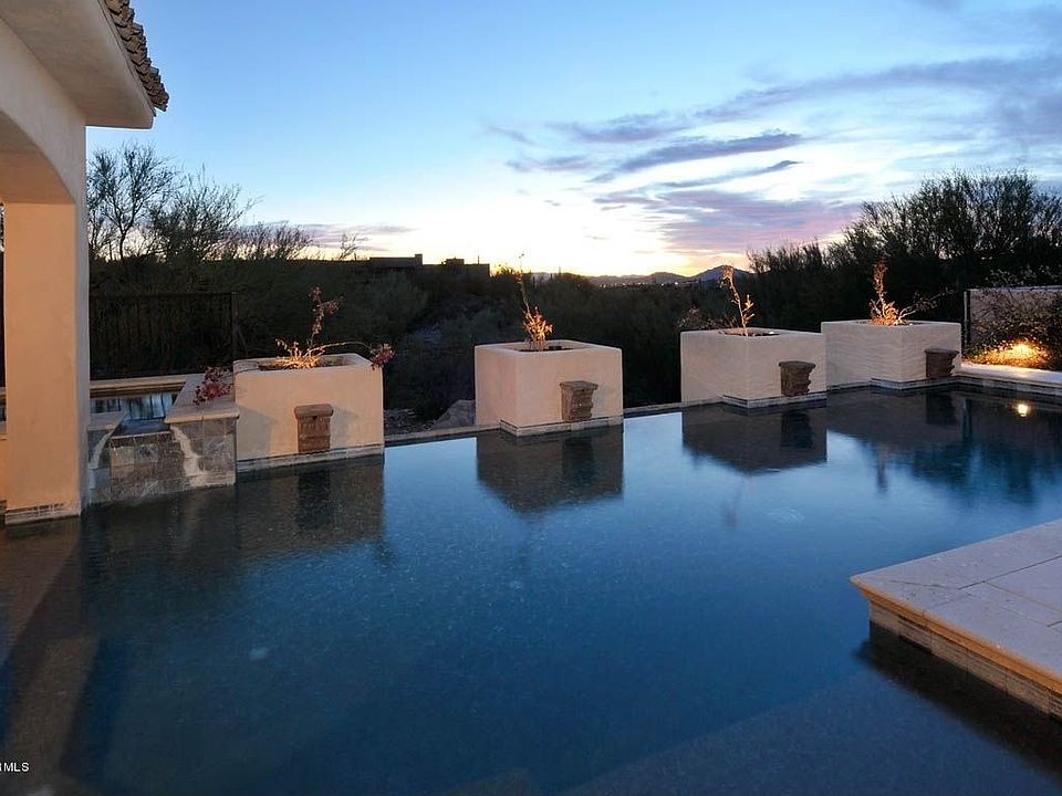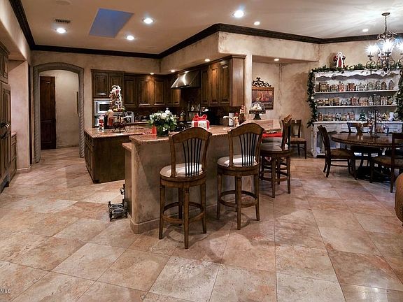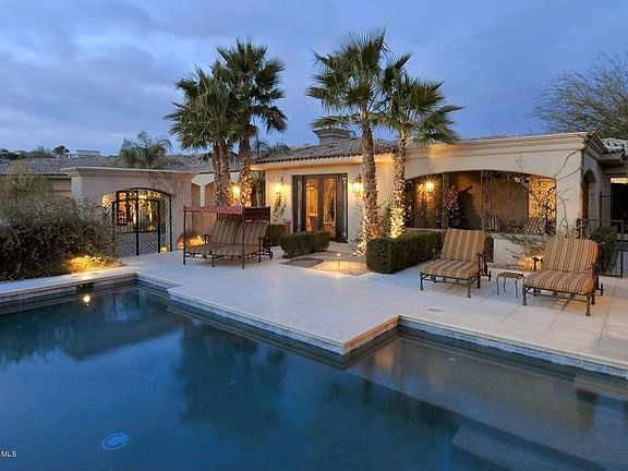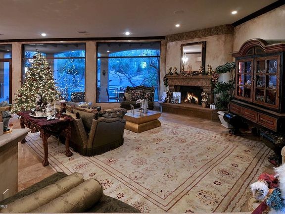 WOW! A Mediterranean master piece! True old world character, richness and charm with modern day luxury. 4bedrooms+media room(front bedroom could be den/office, private entrance), 4 full baths, 2 half baths, 4 indoor fireplaces, 1 outdoor fire place & extended height/length 3 car garage with built-in-cabs. Amenities include travertine floors, carved canterra fireplaces, custom wood pillars, doors & crown molding, custom designer paint, media room w/bar & projector screen, chef's kitchen w/ granite and sub zero, breakfast nook & patio, north facing rear yard and patio, private patio & fountain at rear bedrooms, heated pool & spa with outdoor family room boasting BBQ & bar(appliances are missing), T/V & surround sound wiring, changing room, & views of canyon & city lights to wow your guests.