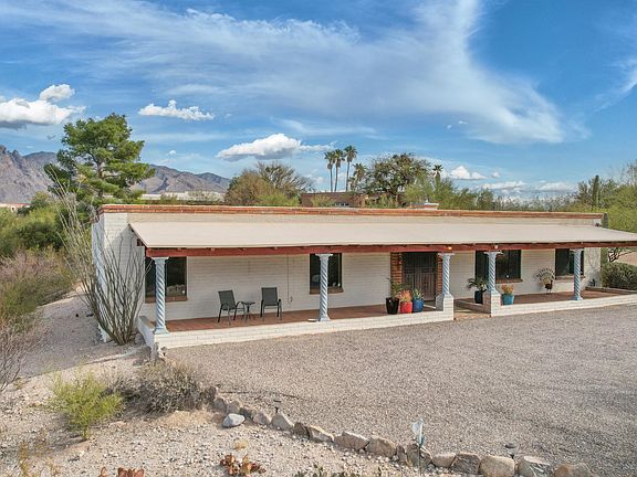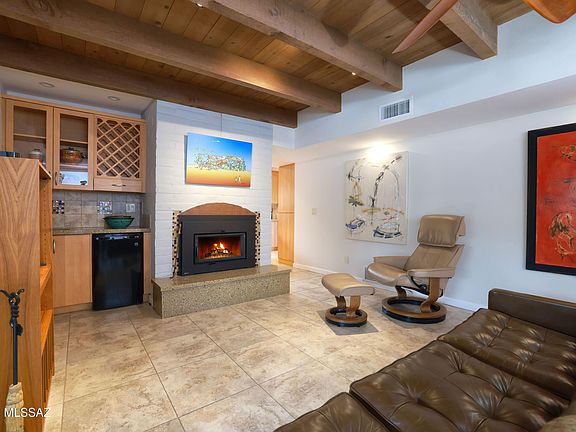 Discover this beautiful territorial home in the heart of the Foothills! The large front porch welcomes you into the family room w/big south facing windows for city views and on to the formal living room boasting gorgeous wood ceilings, cozy FP & built-in bar, ideal for gatherings. Chef's kitchen offers warm maple cabinets, SS appliances & sleek granite counters. You'll find lovely neutral tile throughout with new wood floors in the bedrooms. Generous primary suite features an updated bath & a large walk-in closet. Spacious AZ room provides a great setting for year-round outdoor entertaining. Step outside to your own desert oasis w/a sparkling pool & views of the saguaro-studded landscape. With a 2-car garage & a prime location near shopping & dining, this is Tucson living at its finest.