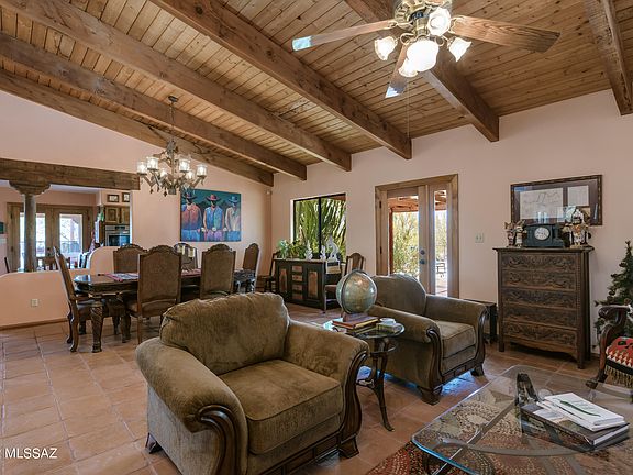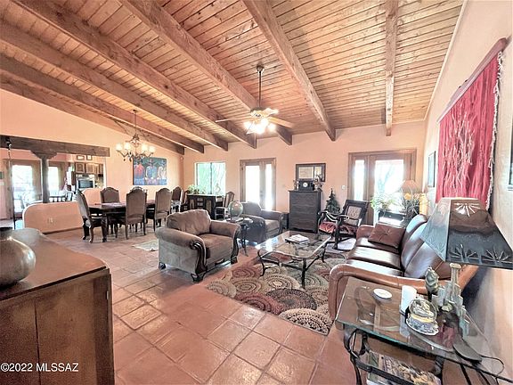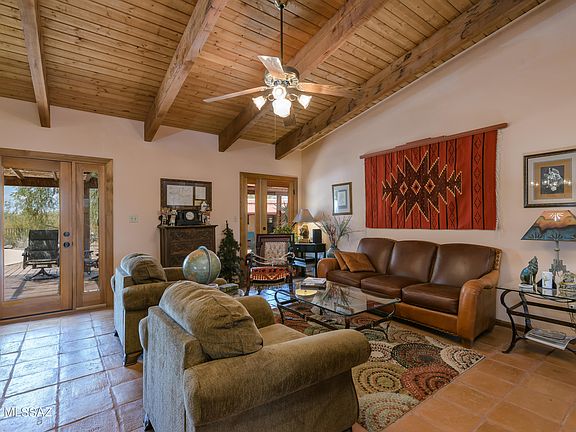 This extraordinary rare find HORSE PROPERTY W/POOL consists of a 2,248 sq ft custom Santa Fe home with a 551 sq ft GUEST HOUSE that sits on 3.4 acres. The main home features 3 bed/2 bath highlighting old World charm with vaulted wood beam ceilings and Mexican adobe pavers throughout (no carpet). The covered patios and pool offer peaceful and relaxing settings, and may be heated with either solar panel or natural gas. The furnished guest house includes combined kitchen/great room, bedroom, bath, 2 covered patios with easy access to the pool. For the horse lover, this property has a corral w/2 covered stalls, 8x20 tack room, 16x10 storage shed, and large round pen. RV carport for the campers in mind. Great neighborhood with site-built only homes that borders Saguaro National Park.