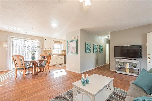 Welcome home to this one level living home. Beautifully updated with awesome wide plank floors, freshly painted throughout. Lovely welcoming front porch with a swing! Open spacious floor plan with a fireplace in the living room for chilly nights. Updated light fixtures too. The kitchen is fresh with white cabinets, tile back splash and solid surface counter top. The french doors open to a deck overlooking the ample yard. This is not to be missed! Conveniently located near shopping and entertainment, major roads.