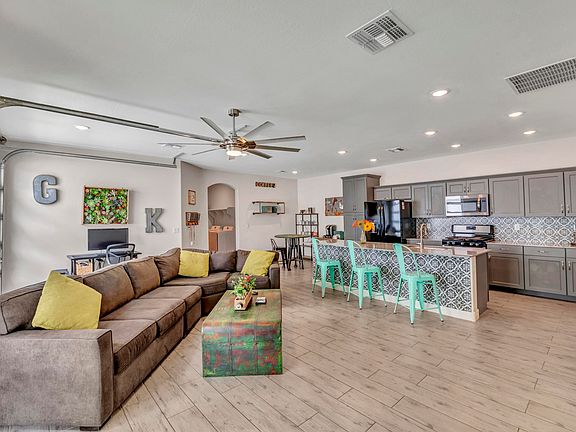 INCREDIBLE OPPORTUNITY FOR ALMOST NEW 2017 BUILD IN POPULAR EASTMARK! Beautiful 2 Bedroom 2 Bath home with contemporary operational glass garage door that opens to the outside patio! Modern open concept floor plan includes gray cabinets, granite counter tops, island/breakfast bar, stainless appliances/gas range, and stylish backsplash. Beautiful wood look tile flooring throughout the entire home! Split floor plan provides privacy at both bedrooms. Master suite includes dual square sinks. Patio has been tastefully done with pavers, synthetic grass and pergola. Front of home overlooks nice greenbelt. Garage at rear. Shudders and modern oversized ceiling fans put the finishing touch on this Dream Home!