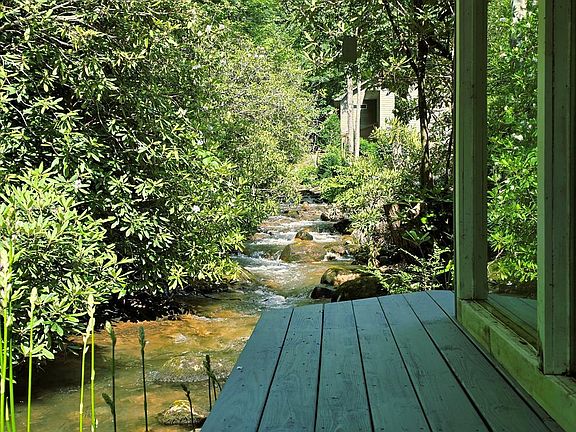 It is with great pleasure (and some awe) that I introduce you to the "Geode House." Franklin is the gemstone capital of the world, and this custom home is truly its hidden gem. From the moment you turn onto the gentle, view-filled mountain road, the only sound you'll hear is the BOLD, rushing creek all the way up. The Geode House embraces 240 feet of creek frontage, heard from every room, and backs up to National Forest for privacy. The extraordinary glass surround sunroom overlooks the singing creek and the newly painted, and updated, deck invites you to watch hummingbirds and sip your morning coffee. This breathtaking 3 bed, 4 bath home reveals a spacious interior full of character, charm, and warmth. Custom hand built kitchen cabinets and vanities reflect the treasures found within a crystal geode. The bright, open layout offers a private, elegant space for hosting friends and family. The Geode House intertwines nature's tranquility with a master craftsman's creativity. Homes like this are truly once in a lifetime.