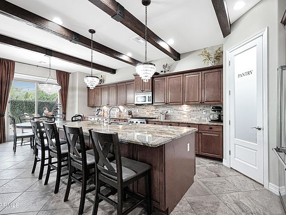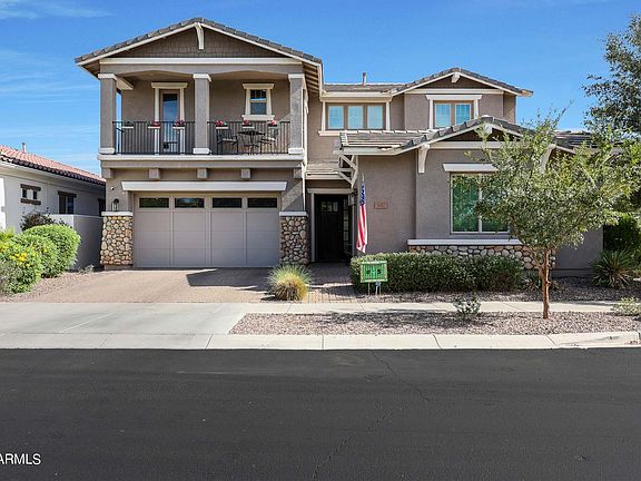 ***Seller offering $15K in concessions!*** Experience LUXURY living in this captivating Eastmark home filled w/ upgrades galore! 5 Bed + THEATRE ROOM + Spacious Loft + 3 Car Garage. GOURMET kitchen w/ VIKING appliances, granite countertops, backsplash, upgraded cabinets & large island. WOOD CEILING BEAMS in great room, theatre room & owners bedroom + COFFERED CEILING at foyer w/ CROWN MOLDING. Stone feature wall in great room w/ MULTI SLIDE PATIO DOORS & fireplace. Impeccably upgraded loft w/ custom built-in BEVERAGE CENTER, BRICK ACCENT wall & WAINSCOTING everywhere! Upstairs ensuite w/ private beverage center too! PERMANENT HOLIDAY LED LIGHTS on exterior, upgraded flooring, shutters, water softener, laundry room w/ cabinets & sink & OWNED SOLAR. Covered patio, sparkling pool & waterfall , outdoors lights make for an inviting atmosphere - low maintenance backyard! **Theatre seats, projector & theatre couches, loft furniture & 3 loft TV's all convey! Pool table in negotiable as well!!! Former model home that has the Owners Suite on the first floor! Can Lighting throughout this home, Large Balcony, Tile Surrounds in Master Bath & Shower, Paver Driveway & Walkway, 5 1/4'' Baseboards throughout & so much more! Corner Lot with lots of room for guest parking and an open Front with greenbelt just steps away! Theatre room could convert to 6th bedroom or dining room. 5th bedroom/office is located downstairs too. This home has it all - A MUST SEE!!!