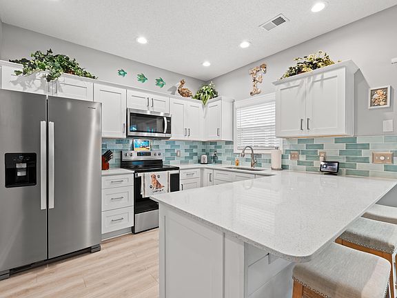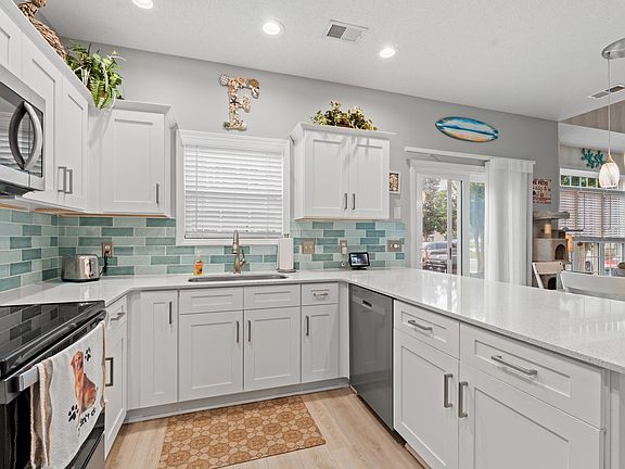 This beautifully upgraded 3-bedroom, 2.5-bath condo offers 1,640 sq ft of coastal comfort in a golf cart-friendly community, just five blocks from the beach offering the ideal combination of convenience and seaside living. This unit is larger than some of the smaller units at 1,640 square feet. This well-cared-for home stands out with extensive upgrades and stylish finishes throughout. The kitchen is a showstopper, featuring quartz countertops, a shiplap-accented center island, stunning coastal tile backsplash, upgraded cabinets, and brand-new stainless-steel appliances. (April 2024). The open-concept first floor boasts new windows, luxury flooring, updated sliding patio doors, all-new light fixtures, ceiling fans and a brand new storm door installed (2024). The primary suite is located on the 1st floor. The oversized primary bedroom is a true retreat, complete with a beautifully tiled, upgraded stand-up shower and a brand-new toilet. Laundry is also on the 1st floor and has a 1/2 bath. Enjoy the convenience of having your laundry on the 1st floor. The laundry room has updated cabinetry, and there's no shortage of storage thanks to abundant closet space throughout. Upstairs, the full bathroom features a newly tiled shower, new flooring, and a new toilet. Enjoy peace of mind with a new HVAC system, air handler, and smart thermostat installed in September 2024. Whether you're looking for a permanent residence, beach getaway, or rental investment, this spacious and stylish condo is ready for you. Most of the furniture as seen in photos will convey with the property. There is a small list of furniture that does not convey. Nestled at the back of the neighborhood, this condo’s location offers added privacy and tranquility, making it a true escape. This home is a rare find with its blend of style, functionality, and proximity to the beach. Enjoy the convenience of shopping and restaurants that are a golf cart ride away. Don’t miss your chance to own one of the largest and most upgraded homes in this desirable coastal community! Schedule your showing before this gem flies off the shelf!