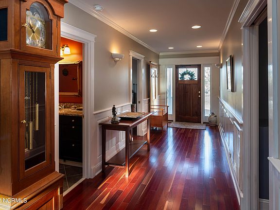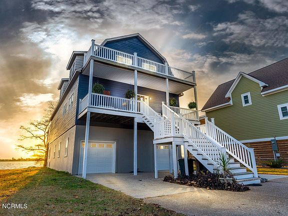 PRIME WATERFRONT HOME in the quaint little town of Bridgeton! Every day the sun is out, you can expect gorgeous sunsets on the water and behind Historic New Bern, as this home sits ENE across the Neuse River from downtown. If you enjoy fishing, you can catch speckled trout and red drum right off the concrete dock! At the end of this said dock, water depth varies from 4+ to 5+ feet. The ground level, 2 car garage is partially heated, has another room in the back, and comes with a half bath. By the photos you can see the Seller uses this space for his workshops. The Seller built the home in 2003. Being a master woodworker, he designed and made all cabinets, dresser drawers, tables, entertainment centers, and the wood for all bed frames. If a Buyer is interested in any of the custom made wood furniture, the Seller is willing to negotiate. As you enter the home into the foyer, you'll see the crown molding, and immediately appreciate the Brazilian Cherry Wood flooring. There's a bedroom/office, full bath, and laundry room on the right. The master bedroom is on the left, with a large master bathroom which includes a Therma Spa bubble tub, walk-in shower, and private toilet room. Entering into the dining and kitchen area, you will see the beautiful view from the windows. The kitchen with a sitting bar is to the right, and a gas fireplace to the left. There's plenty of lighting placed throughout the ceilings, so that the unique style of this home can be fully taken in. The Old Eastern Pine Timbers, and the vaulted ceiling in the living room, proves how special this home is. From there you have two separate sliding doors to the ''hurricane'' screened porch. Exit the screened porch to the right, and go down the stairs to a large open deck. The third level has a large loft and 2 bedrooms, each with their own full bathroom, and separate sliding doors to a shared open deck. This home has SO MUCH to offer! Don't let this one get away!