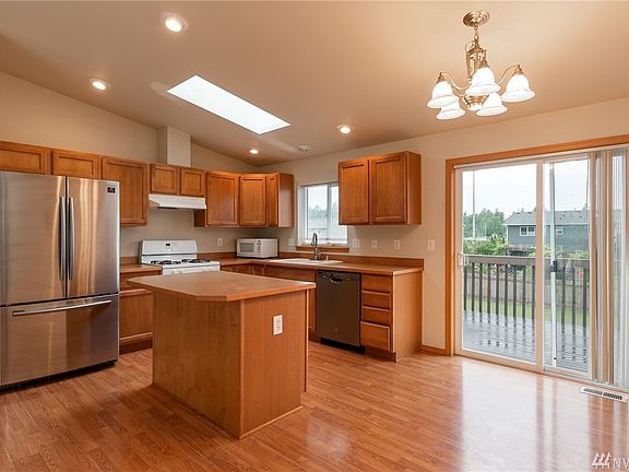 Desirable neighborhood, close to parks and schools. Bright open floor plan with 4 beds and 2.75 baths. Cozy living space off of the kitchen with a gas fireplace and vaulted ceilings Skylight and a back deck off of the dining room. Master bedroom with bathroom and 2 closets. Family room down stairs along with a bedroom and 3/4 bath. Fenced spacious backyard. Plenty of room for a garden or to play!