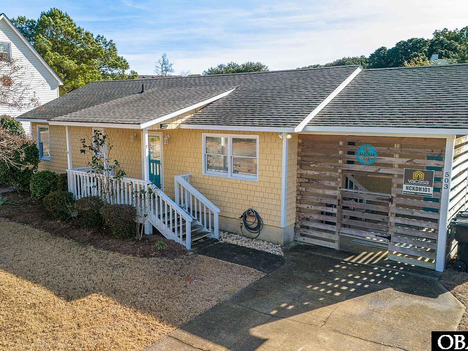 Step outside to your private backyard oasis, where a spacious deck, charming pergola, and fully fenced yard provide the perfect setting for relaxing or entertaining. Enjoy sun-soaked afternoons in a space thoughtfully designed to maximize light while minimizing wind. Inside, you'll find a cozy bright interior that creates a warm and inviting atmosphere. The functional layout includes two bedrooms, one with an en-suite bath, and a second full bath conveniently located off the main hallway near the laundry room. A dry entry through the carport leads directly into the kitchen, making it easy to bring in groceries or gear after a day of beach adventures. Whether you're seeking a primary residence, a vacation retreat, or an investment opportunity, this home offers the quintessential Outer Banks experience. Schedule your private showing today!