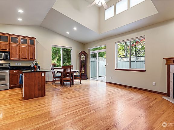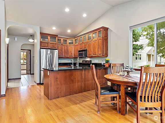 Enjoy one-level living, no stair entry, in this 2-bed, 1.75-bath corner end unit with a 2-car garage. Wood floors, vaulted ceilings, & a cozy gas fireplace create a bright & inviting atmosphere. Kitchen features cherry cabinets, granite countertops, & stainless steel appliances. Relax in the soaking tub & stay comfortable with ceiling fans and custom blinds. Wide hallways for easy access. Bonus room above the garage gives added space. Community clubhouse with a game room. Conveniently located near all amenities. Trails & Parks nearby.