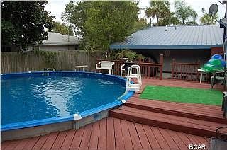 Quaint Old Florida beach house walking distance to the beach! What a location! This Bahama Beach neighborhood is about two miles from Pier Park. The yard is a good size and comes equipped with 2 large yard buildings, an above ground (partially in ground) pool, and a great deck--all synergizing to create that perfect tropical escape. The home has areas of flex space that present opportunities for additional rooms for home schoolers, for art or music or extra sleeping areas for guests. The kitchen is spacious with decorative backsplash, gas range for all you chefs, neutral large tile for easy maintenance. The dryer hookup could go electric or natural gas.