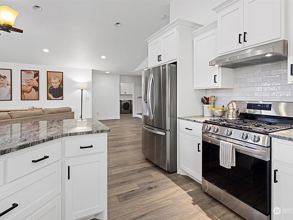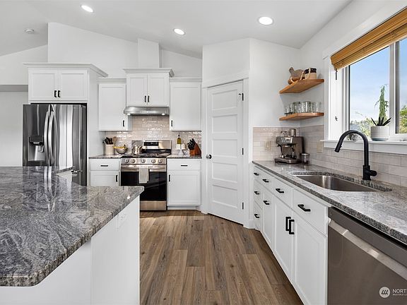 Welcome to this beautifully renovated Nooksack home! Located at the end of a cul-de-sac, this home features 3 bedrooms, 1.75 baths with vaulted + open concept living/kitchen, gas fireplace and bonus room upstairs! New custom kitchen cabinets, stainless steel appliances, open shelving, countertops, new paint, brick fireplace, flooring and so much more! Large primary bedroom located on main floor with a gorgeous en-suite and spacious closet. Fully fenced backyard with oversized patio, plenty of space for a playset, firepit and a garden shed. Wonderfully located minutes from Nooksack schools, downtown Everson, 15 minutes to Bellingham and 10 minutes to Lynden. You don't want to miss out on this gem!