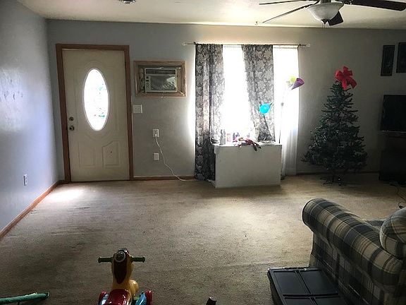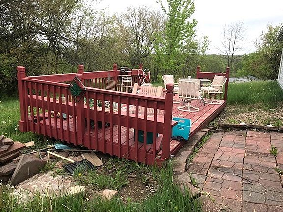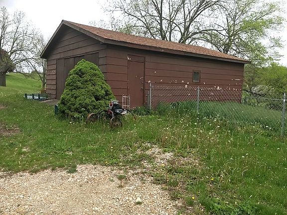Set on a quiet serene street in a small town you will find an 1164 SF 2-bedroom, 1 full bath, 1 ¾ bath slab home. The house and garage sit on .529 acres with trees all around the yard. The front entrance features a brick tile patio. The entryway has laminate flooring with the ¾ bath located here. The first bedroom has laminate flooring and a walk-in closet. The spacious kitchen has linoleum flooring. Appliances include a microwave and stove. There is no refrigerator or dishwasher. There is plenty of cupboard space for storage. The open dining/living room area is carpeted. Walk out the oval glass decorated door to a backyard deck and patio. The master bedroom is located next to the large main full bathroom. This bathroom features a Jacuzzi tub, shower, make-up station and has newer linoleum flooring. There is a nice roomy utility room for a washer/dryer hookup and extra storage. The garage is 24 X 24, 576 SF and is detached. The house has good vinyl siding and an asphalt roof. A window AC unit is in the house and the gas furnace and water heater are supplied by an LP tank. Additional features outside include a chained-in fence area for your pets and a water hydrant. The property is being sold as is, where is with all contents in and outside the buildings. Sellers will not remove any of the contents. This house needs lots of TLC but with a little bit of work this can become your home. All information obtained from Owner and Public Records.
