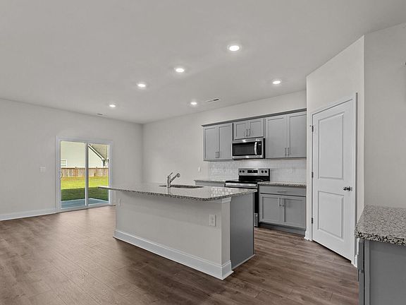 The kitchen has granite counters, has an oversized island for extra seating and a large pantry. It opens to the dining area and a spacious living room. A downstairs bedroom with a full bathroom completes the main level which features Vinyl flooring in all common areas, bathrooms & laundry room.