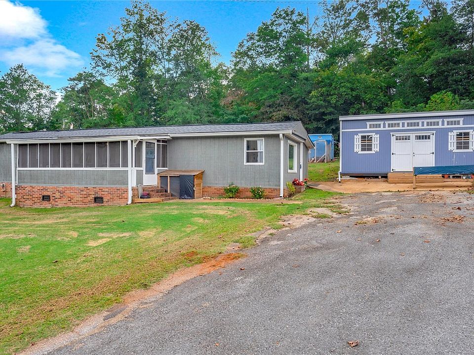 This home is a 4 bedroom/1 bathroom manufactured home in the Laurel and Hardy fishing lake neighborhood in Marietta. It is on a permanent foundation and is de-titled. It is nestled in a quiet valley on a cul-de-sac, and it sits on a double-sized corner lot of 1.05 acres, with a view of a fishing lake. Large living room and master bedroom with large (9'x6') walk-in closet. The kitchen was gutted and remodeled in October 2022 –all new counter tops, cupboards, sink, lighting, dishwasher, refrigerator, and stove. All rooms freshly painted. Laminate flooring throughout and a screened-in front porch. Roof was replaced in 2020. Next to the home is the 2-years young 12x36 foot shed used as a workshop and for extra storage. It is fully insulated and lined and has electricity. Great location for homesteading and backyard chickens. No HOA. Plenty of room for Recreational Vehicles or for your rural vacation home use, with stocked fishing lake and tackle shop within walking distance. Private well and septic. Quiet neighborhood with easy drive to restaurants and shopping. 15 minutes to Traveler’s Rest, 20 minutes to Pickens, 30 minutes to Greenville, 35 minutes to Hendersonville, NC, 60 minutes to Asheville, NC. Gorgeous natural attractions nearby. 13 minutes to Table Rock State Park, 25 minutes to Caesars Head State Park, 30 minutes to Paris Mountain State Park.