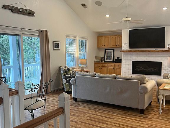 This home is guaranteed to meet every expectation. Great room is bright, airy and open with lots of sunshine flowing through out. The fireplace installed inside the wall is surrounded by sparkling white tile that catches your eye immediately. The wood beam mantle above is a perfect blend with the custom entertainment center beside it. The great room is designed to have the dining room flow smoothly into this spacious top floor living. The kitchen with it's granite countertops provides more than ample space for the chefs of the family to prepare delicious meals. The kitchen was designed with lots of cabinets for all your small wares, utensils, equipment etc. A pantry is included for any overflow. Appliances are whirlpool- stainless steel with flat top range and built in microwave overhead and an inset farmers sink with disposal. Sliders in front of the great room and behind the dining room open up to expansive decks that allow additional seating for relaxation or dining. Walking down the hall a beautiful muriel is painted on the wall depicting the true ambience this home proudly showcases. Two french doors allow entry into the master suite. The master bath has double vanities, walk in closet, water closet, tiled shower and whirlpool tub that offers views of the sound. A powder bath is located on this level as well. The first floor has 3 additional bedrooms of which one is a master suite, and the other two share a hall bath. Laundry closet is on this level. The garage walls have been sheetrocked with a knock down finish and the floor has an epoxy coat finish over the concrete with a ceiling fan overhead. There is a ping pong table, foosball table with bikes and games galore! A security system for the house ensures peace of mind when you are away. Outside is a heated pool, hot tub and tiki bar. This home definitely has all the amenities a family can enjoy while being at the beach. The Currituck Club has lots to offer including pools, tennis courts, health club, club house, restaurants, trolley cars to beach, private beach parking, and last but not least - GOLF!