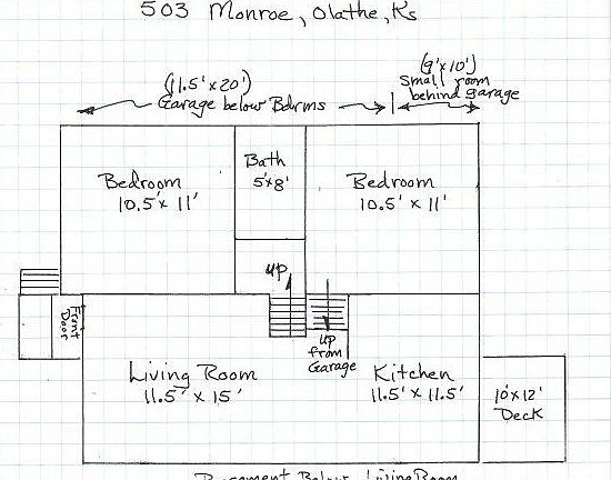 Clean and well-kept split-level duplex, gray with red brick on the front. Two full 10.5 by 11 foot bedrooms and one 9 x 10 foot extra room. Single bathroom. 11.5 by 15 foot living room and kitchen/dining area. Single car 12 x 20 foot garage (finished/heated). Basement with washer/dryer hookups. Natural gas heat, central air conditioning, storm windows, raised 10 x 12 foot deck on back of house, and fenced back yard. Mature trees. Nice neighborhood. Pets generally not accepted unless owner is meticulously clean and the pets don't disrupt the neighbors. Outside pets are not allowed.Located 3 blocks north of Santa Fe (135th St.) and 2 blocks east of K-7 Highway. One year lease with month-to-month lease after first year. Looking for renters who will take care of the duplex. Can show almost anytime. Available by October 10th.