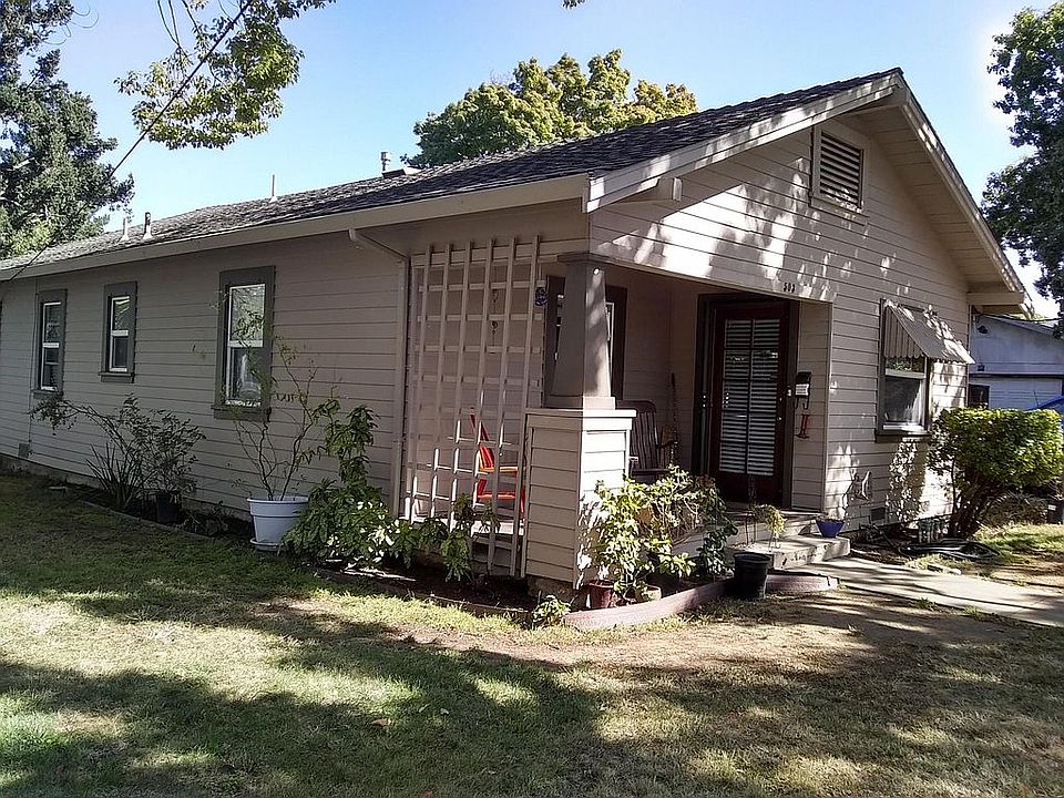 2 Br/1Ba, Newly Remodeled, New Stainless Appliances, Attached Garage, Clean, Quiet Location, Hardwood Floors, 30ft x 20ft Fenced Back Yard. A few blocks from downtown Mt View Restaurants, EaglePark w Pool, Mt View Public Library, Coffee Shops. Quick Access to 101 and 280 Freeways as well as up to Foothill Rd. Professional, Residential Neighborhood. Washer Dryer Inside Attached Garage. Nice back yard w big tree and small porch. Nice front yard lawn. Charming back yard perfect for personal garden or just sitting in the sun in the quiet relaxing back yard. Back yard fully fenced and private. Owner Pays For Water and Weekly Gardener. No Smoking. Gardener Takes Care of Yard. * 2 bedrooms, 1 bath, 2 separate driveway parking spaces, approx 950 square feet * This detached house is technically part of a duplex; however, the only connection to the other unit is a shared garage wall. * Excellent access to downtown Mountain View, Eagle Park & Pool, and Central Expressway, good access to 85 and 101 * Facilities include washer, dryer, dishwasher, microwave, mobile AC unit, and wall AC in one bedroom * Partial furnishing optional, including bookcases, desks, sofa, dining table and chairs, kitchen and dining supplies, and one single bed * Yard care provided, no pets, smoking or waterbeds allowed * One month security deposit required