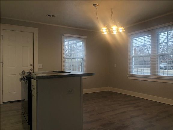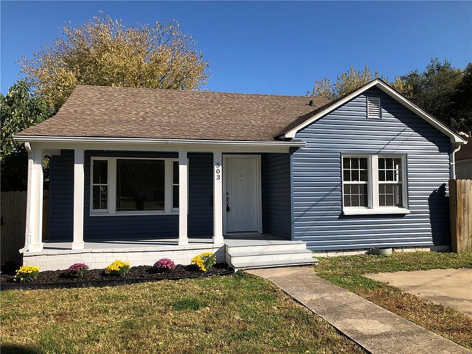 Adorable 3 bedroom single family home with a covered front porch is ideally situated close to the growing downtown Springdale business district and the Razorback Greenway! This home has been recently updated throughout with new paint, new kitchen cabinets & countertops, new stainless steel appliances, vinyl plank and carpet. An open eat-in kitchen area overlooks the large living room and front porch. The bathroom has new double vanity sinks and a new white subway-tiled shower/tub combo. The washer and dryer are included and hidden behind a modern sliding barn door! Lots of windows throughout provide lots of natural light. Backyard is fenced with a storage unit. Pets negotiable. Move-in ready!