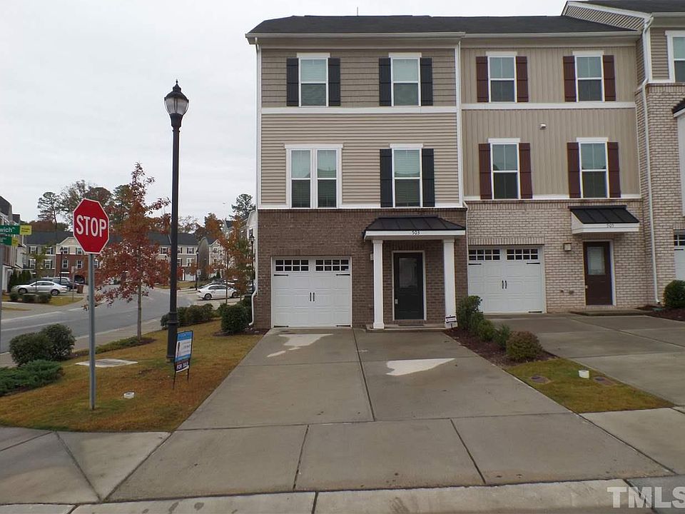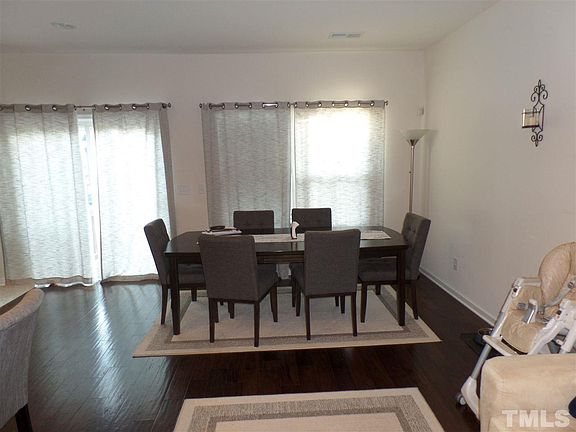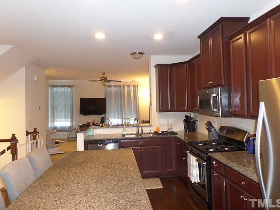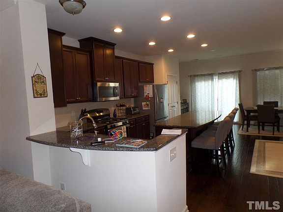 Upgraded 'East' facing 4 Bedroom/3.5 Bath End Unit Townhome, ideal floor plan with 1st floor bedroom with private bath, 2nd floor kitchen with Granite Counter Top, tile backsplash, living, dining room, deck, and Master bedroom with Trey Ceiling, walk in closet, separate tub and shower, additional 2 bedrooms and much more, hardwood stairs up to 3rd floor, all bathroom tiles upgrade. Security systems, google fiber available.Close to RTP, I-540, shopping centers, Community Sw.Pool Tennis Ct.