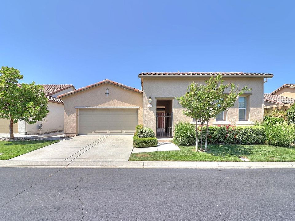 A rarely available Woodside model featuring the unique detached guest house option with gorgeous interior upgrades and a gated and covered entry corridor that opens into a charming central courtyard. Features include attractive jumbo tile flooring in the main areas and baths with carpet in the beds and den, lovely honey-stained cabinetry throughout, a den off the entry that can serve as a formal dining room if preferred, an elegant fireplace in the great room, nice blinds throughout, and stylish lighted ceiling fans in the living room and primary bed. The delightful kitchen boasts granite tiled countertops with under cabinet lighting, sleek black appliances including gas range and French door refrigerator, and a built-in breakfast table extending from the large central island. The luxurious primary suite has separated vanities, an engineered marble shower with bench seat, and a big walk-in closet with extensive organizers. Guests will enjoy the comfortable 2nd bedroom or the privacy of the detached Casitas with a private entry from the courtyard. Relax outdoors on the fully covered back patio flanked by lush greenery in a fully fenced backyard. Home includes W/D, a whole-home fire suppression system and a custom workbench with cabinetry in the garage. Trilogy is a 55+ community.