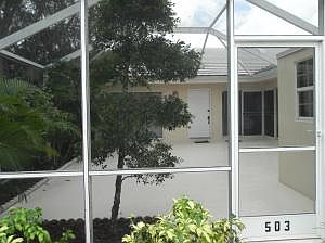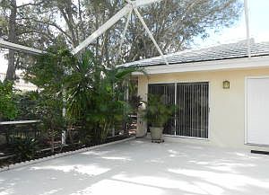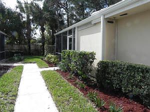 Priced to sell quickly- seller relocating. Very well-maintained, rarely lived-in screened, private rear patio home, with new roof--assessment has been PAID! Pet friendly community!Roomy screened patio with many plants/lush foliage outlining the patio. Single floor living, easy in & out sliding doors to patio. Create your outside paradise! Basic cable, exterior maintenance included, lock up and go. (Optional security system) Built in closets and upgrade of wall unit, gives lots of extra cabinet storage there, tile floors and carpet, new water heater, verticals. Convenient location, quick drive to I-95,shopping,grocery, 3 malls, indoor/out on PGA Blvd, many great restaurants, 15 minute drive to beach. Measurements approximate, information deemed reliable;not guaranteed-subject to change