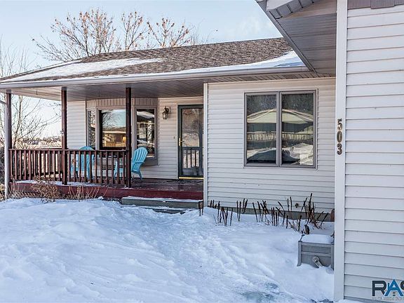 Don't miss the opportunity to own this ranch walkout home that has no backyard neighbors! Located on the edge of town with panoramic views of mother nature, your large backyard feels like country living. This 5 bedroom, 3 bathroom home with 2 stall attached garage has a covered front porch, open floor plan, vaulted ceilings, custom kitchen cabinets with movable island, slider doors to backyard from both the main floor (deck) and the basement (patio), 3 bedrooms on the main level, master bathroom, mudroom with laundry hook-ups as well as a basement laundry room, garage access directly to/from basement, and garden shed. To top it off, it's very close to the new section of the bike path/river/scenic area and has easy access to interstate and HWY 115 to Sioux Falls. Welcome home!
