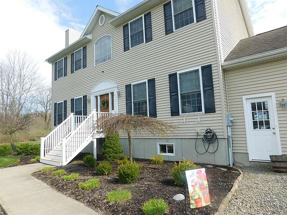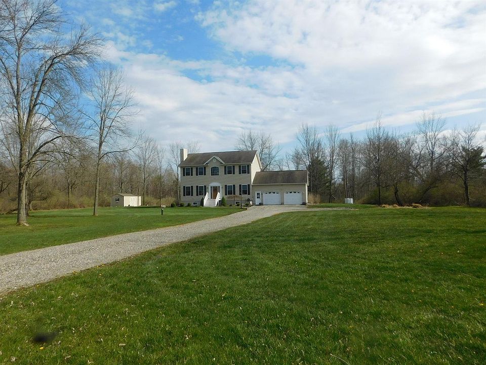 Stylish 2-story Colonial set on a landscaped 3 acres just minutes to Ithaca airport, NE and Cornell. Custom built for these original owners with a fine eye for details including maple wood trim throughout. Tile entry with vaulted ceilings centers this home. Formal living room leads to large eat-in kitchen with center island, oak cabinets, pendant lighting, tile backsplash, breakfast bar open to family room. Stone fireplace with pellet stove in family room. Bright dining room with sliding door to back deck. All 3 bedrooms upstairs including large master suite upstairs with walk-in closet, double vanity, jet tub and separate shower. 4th bedroom/home office also upstairs off expanded landing area. Main level laundry with 1/2 bath also is mudroom space off 2-car garage. Unfinished basement offers 1100+ sq feet of expansion space. Backyard spaces offer privacy with stone patio, storage shed, garden plantings. Bright interior, central AC & offered in turnkey condition. Enjoy modern living!