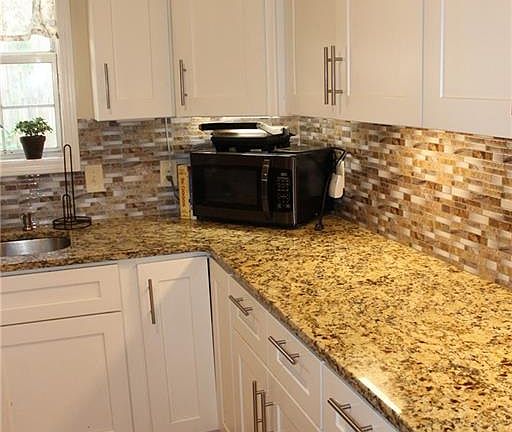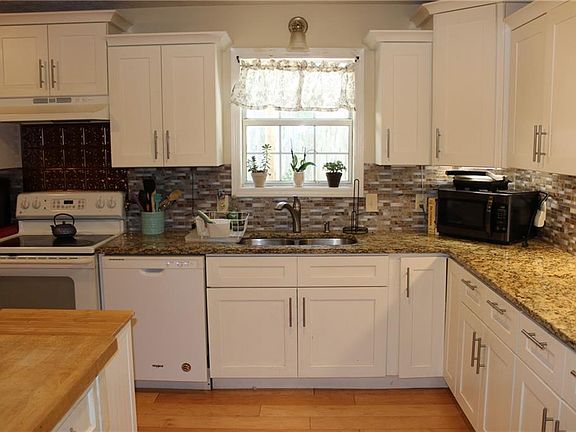 - Kitchen Features: Eat-in Kitchen, View to Family Room, Stone Counters, Kitchen Island, Cabinets White